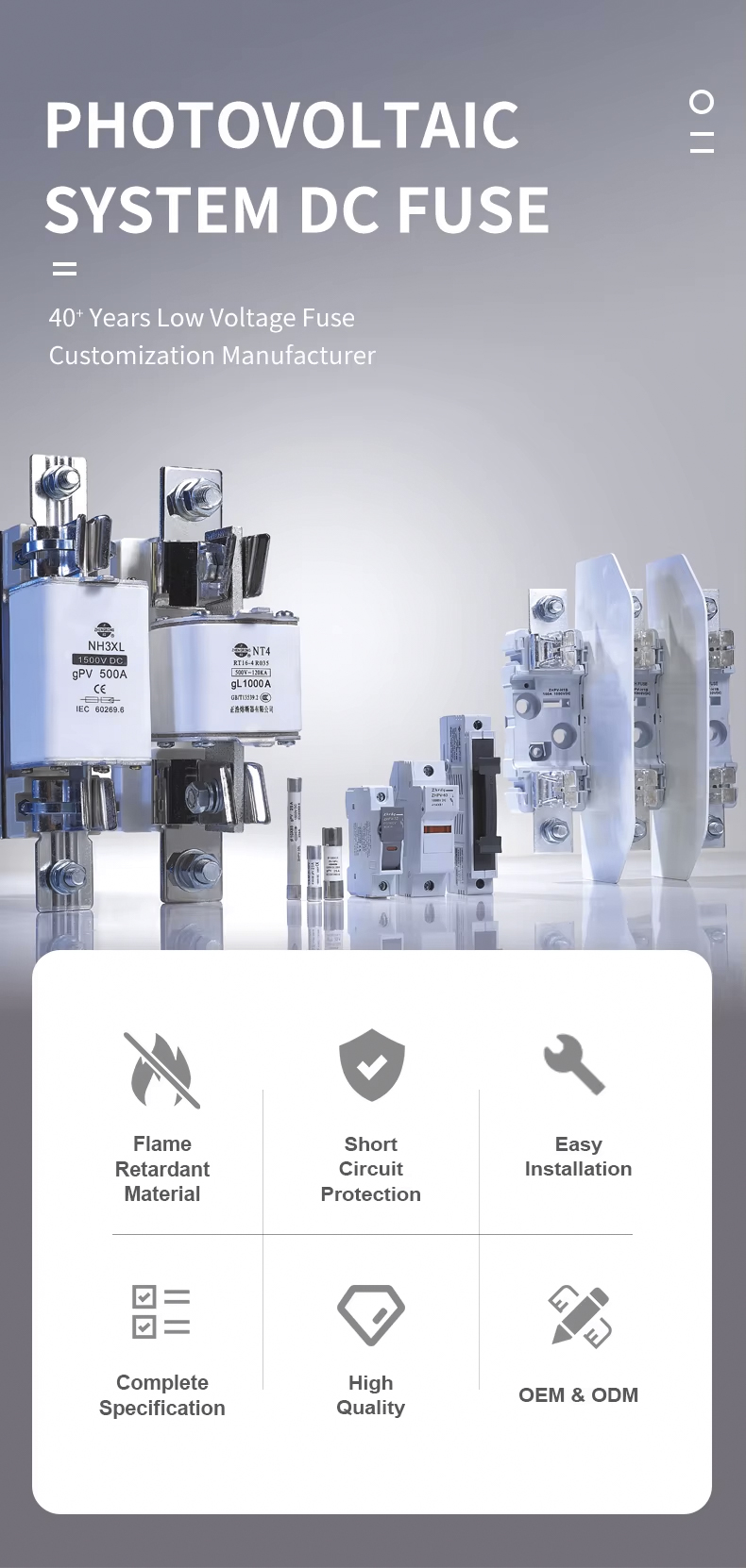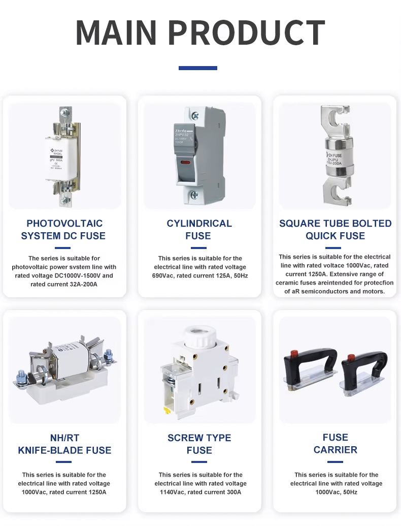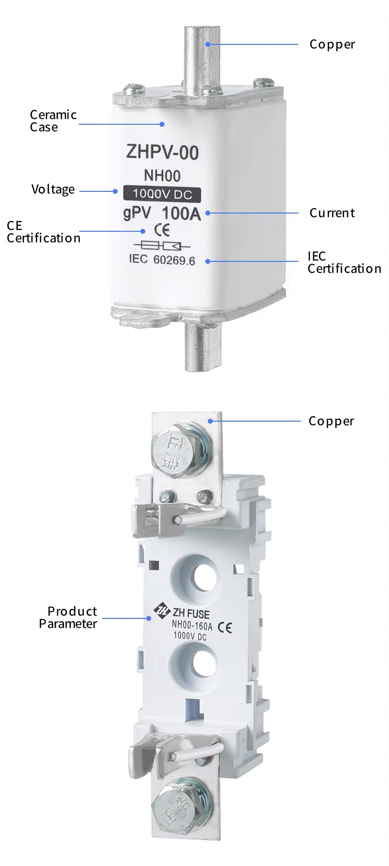 NH00 Systema photovoltaicum DC 1000V 32~100A Fuse Link aptum ad praesidium in systematibus photovoltaicis DC supercurrentibus aptum est. Productum hoc maximam intentionem 1000V DC sustinet et procurrente spatio 32~100A. Solari potentia plantarum et systematum energiae repositionis specialiter destinatur, et efficaciter impedire potest apparatum damni oneris vel brevi ambitu.