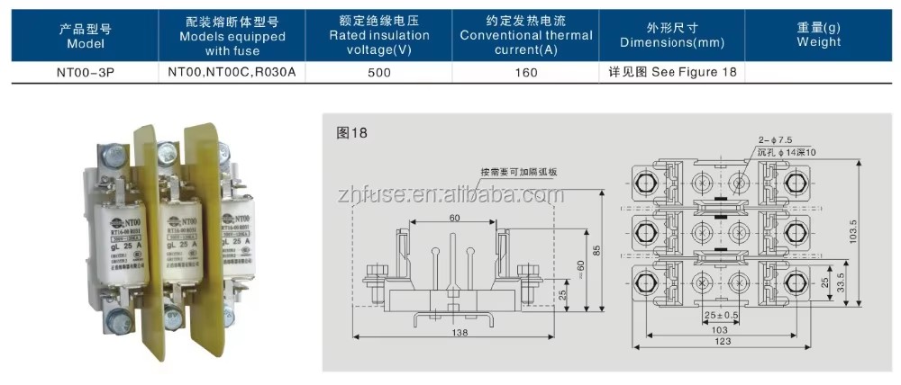 Haec series fuses ex a fuse link et fuse possessor. NT00-3P fuse basi factum est summus viribus tellus Tabulatum vel summus temperatus resin Tabulatum, cum cuneo informibus compositum static contactus. Est aperta structuram cum bono calor dissipatio, alta mechanica vires, certa nexu et facilis operationem. NT00-3P Fuse basi est compatible cum hac series, et NH Fuse Tullius adhibetur ad removendum fuse a basi. Et fuse link ex puro aeris vel argentum sheet (vel argentum filum) signatum in tabernus fistulam factus summus viribus tellus.