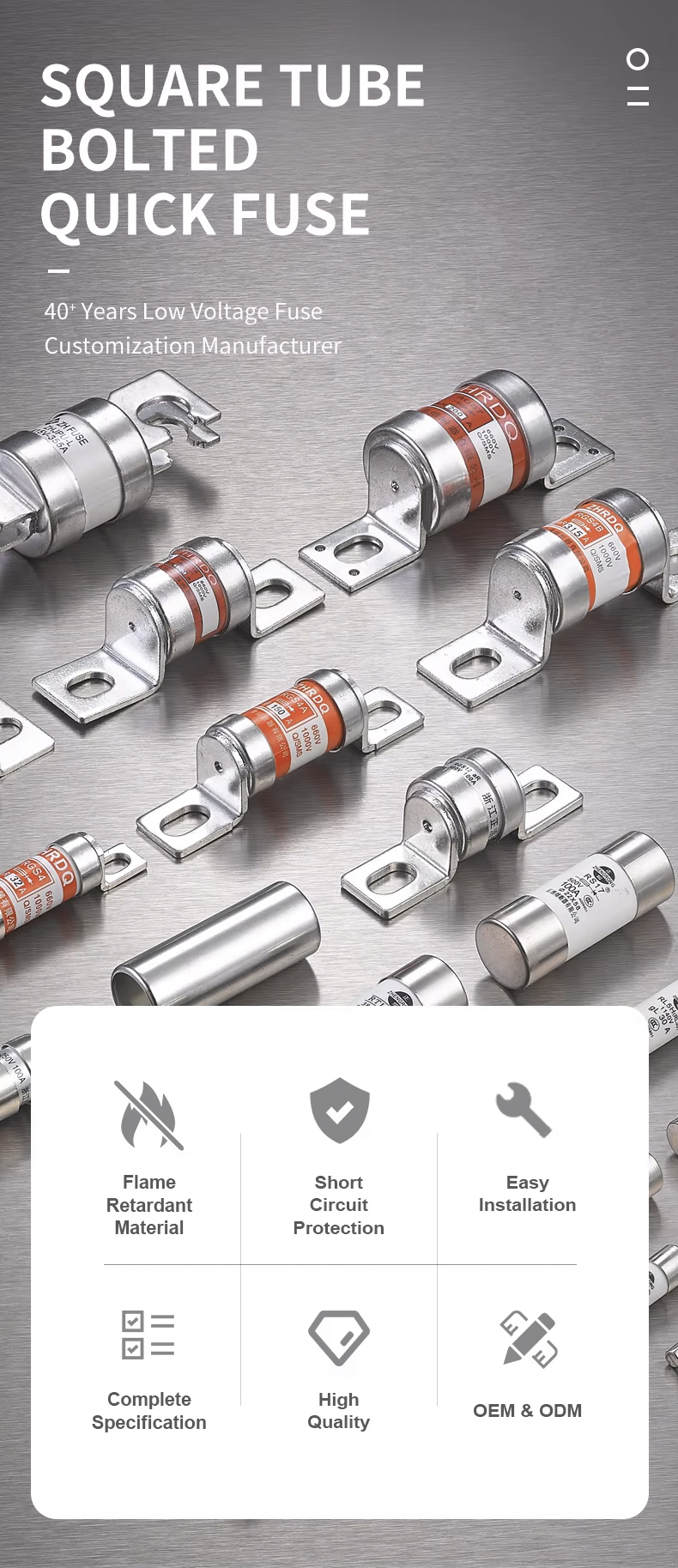 The RS0/RS3-50 500V Fusus est tubus quadratus fuse obsitus, cum intentione aestimationis 500V et capacitatis 50ka fractionis, quae cautionem bonam habet. In quolibet commutatore et inverto adhiberi potest.